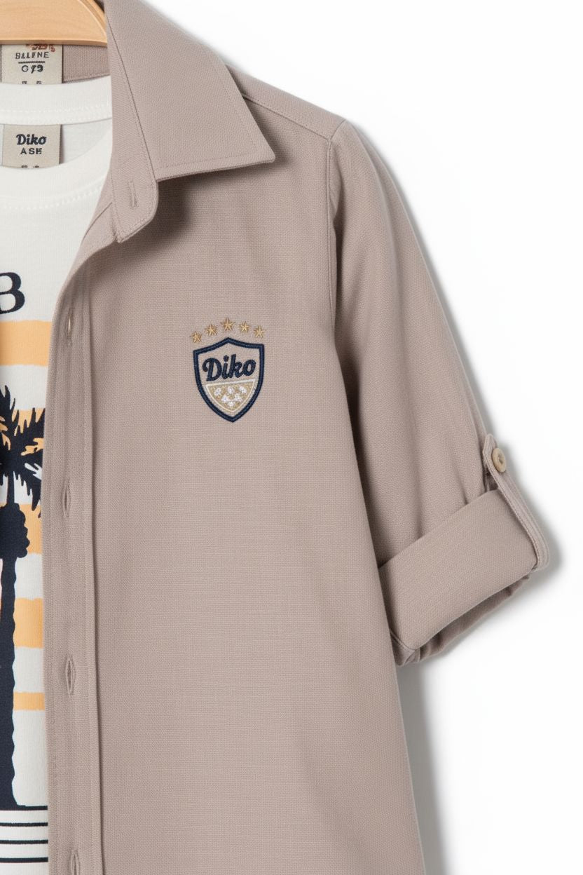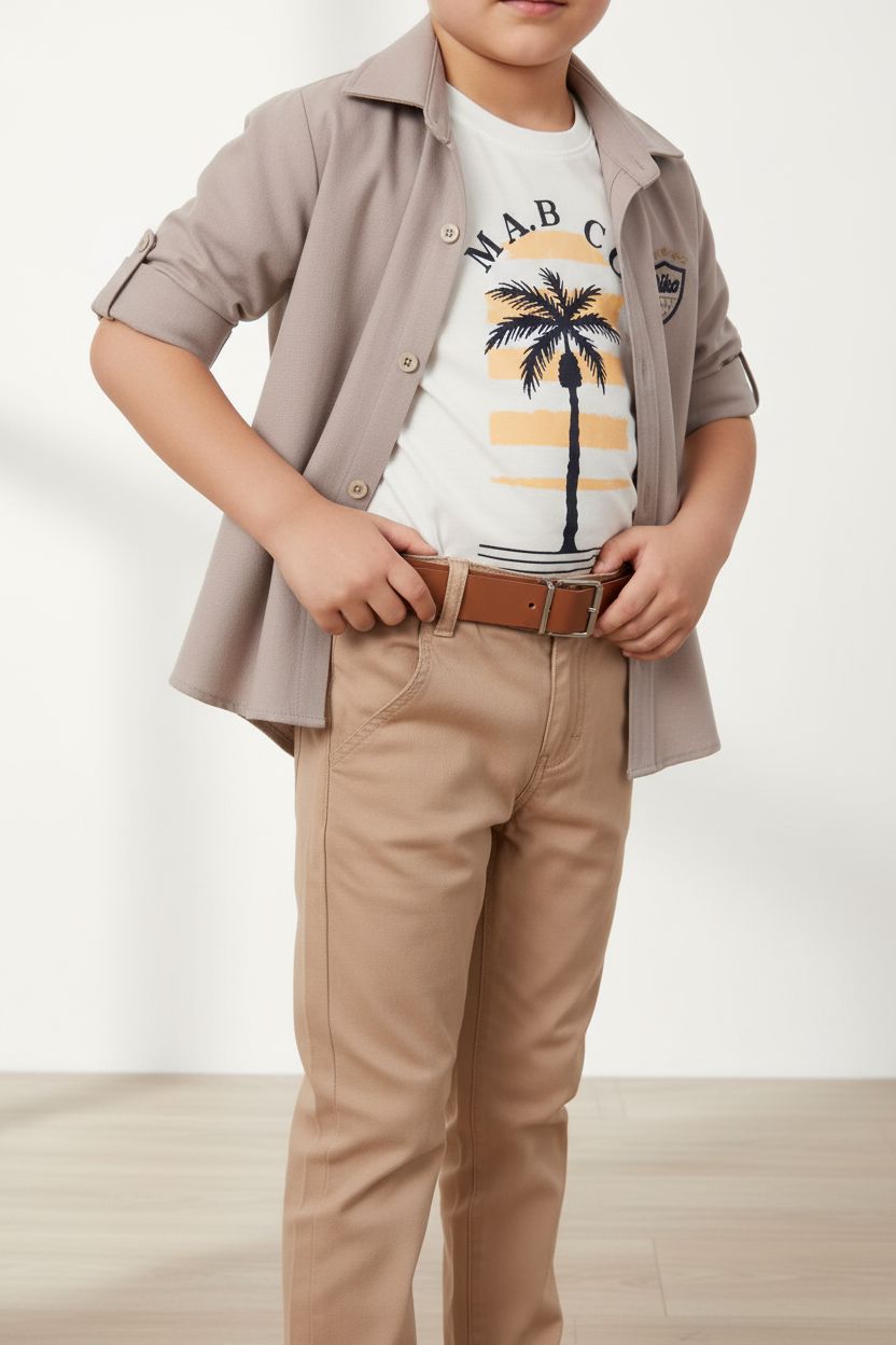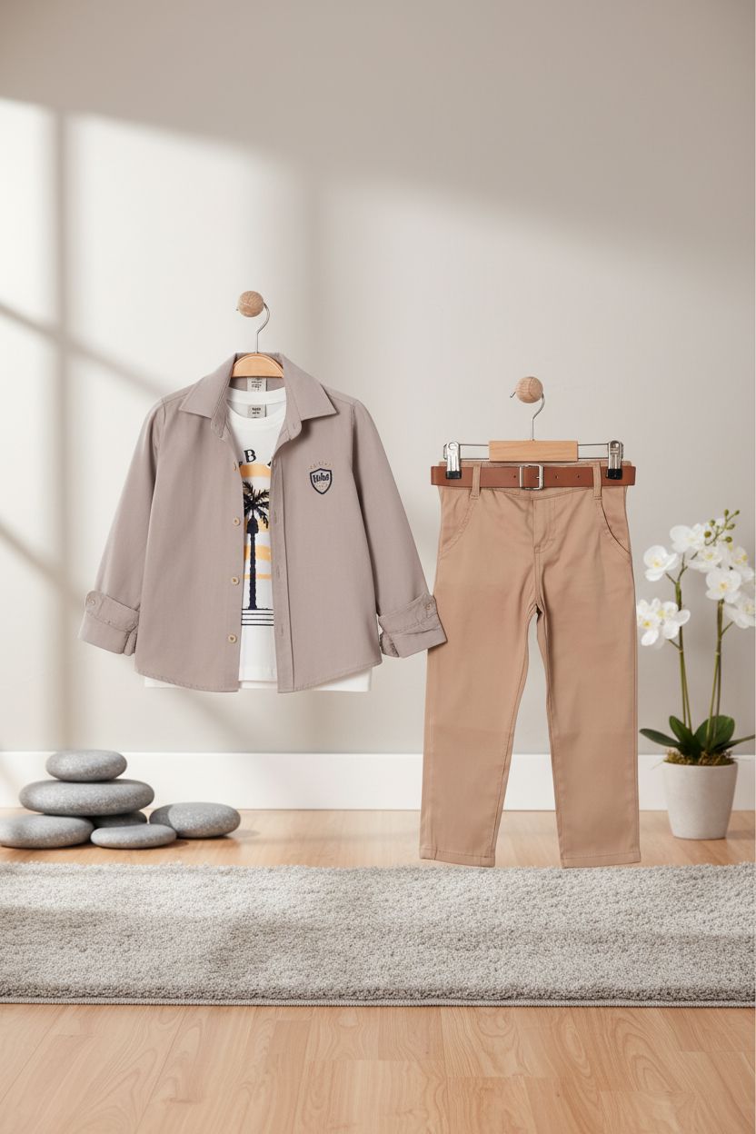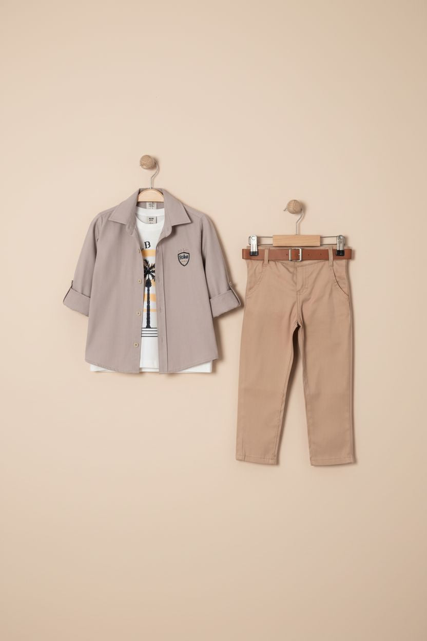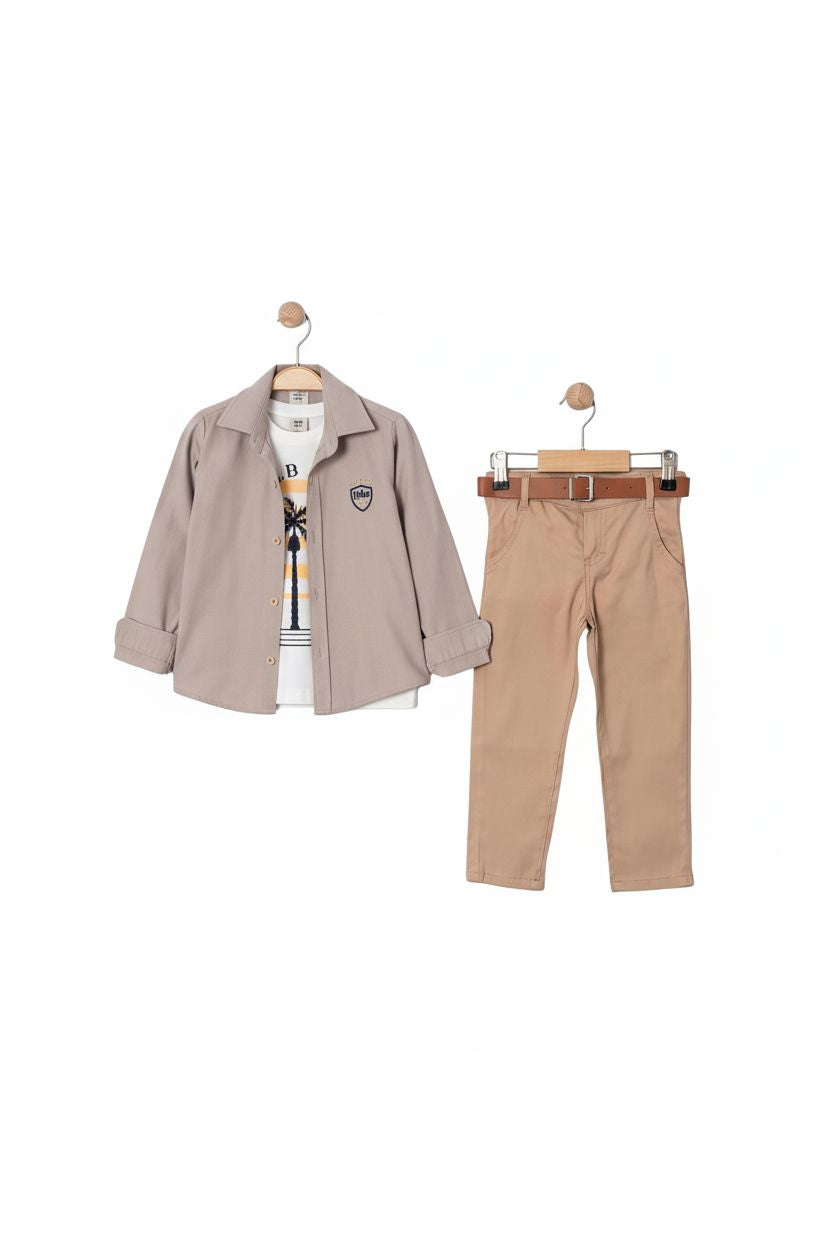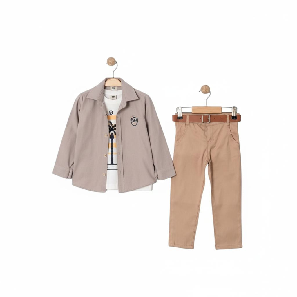 • طقم كاجوال أنيق من 3 قطع • قميص بأزرار مع تفاصيل شعار • بنطال شينو مع حلقات حزام وحزام مرفق • تيشيرت بياقة دائرية مع طبعة نخلة جرافيك • متوفر بلون تاوب • جودة تركية فاخرة • قابل للغسل في الغسالة