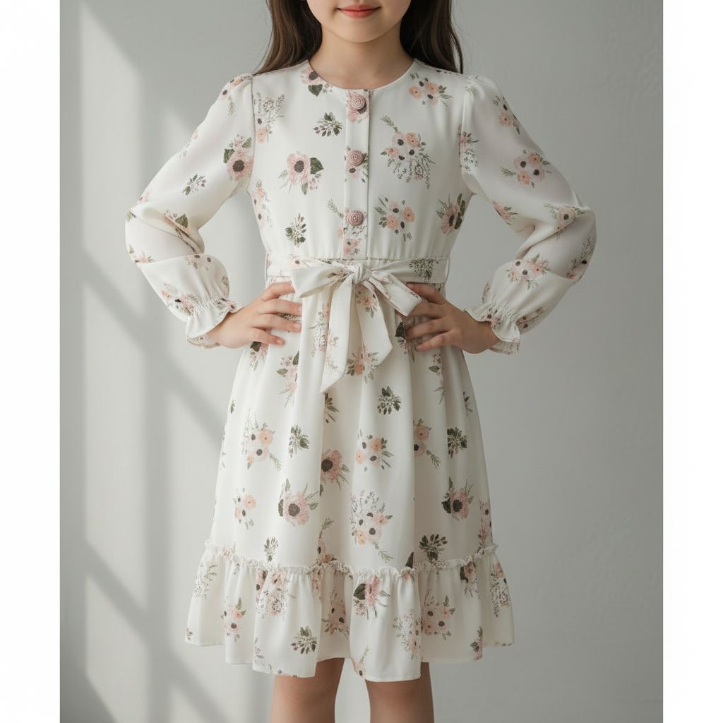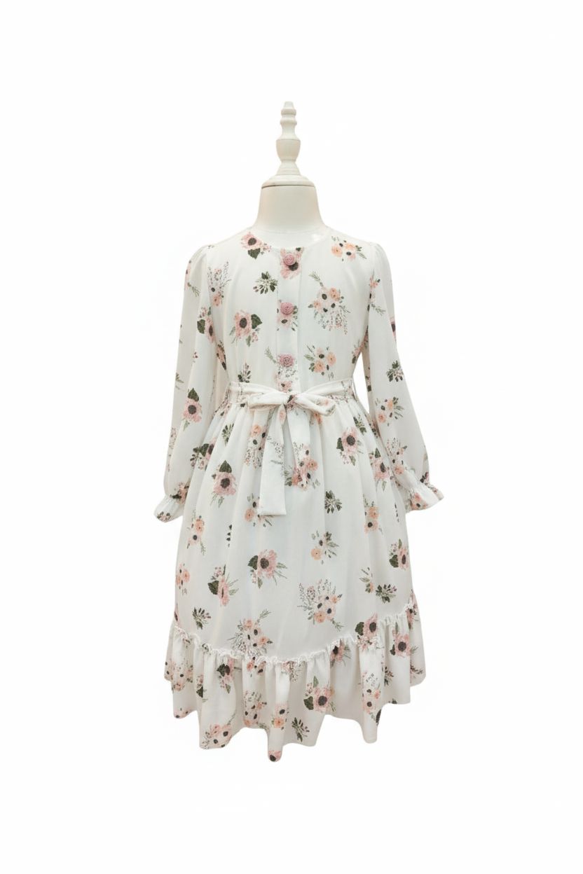 This floral print dress is perfect for family gatherings, visits, and everyday special moments. The design features an all-over floral print in pink, peach, and green tones on a cream base, creating a charming and feminine look for girls aged 9-12 years.