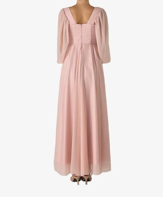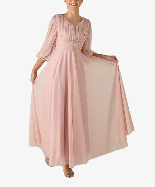 A pink maxi dress for special occasions from the teenage collection. Designed with pleats on the bodice and puffed sleeves, this style features a V-neck and a wrapped front belt with twisted details. Thanks to its soft satin lining, this dress offers a touch of comfort and elegance simultaneously.Â