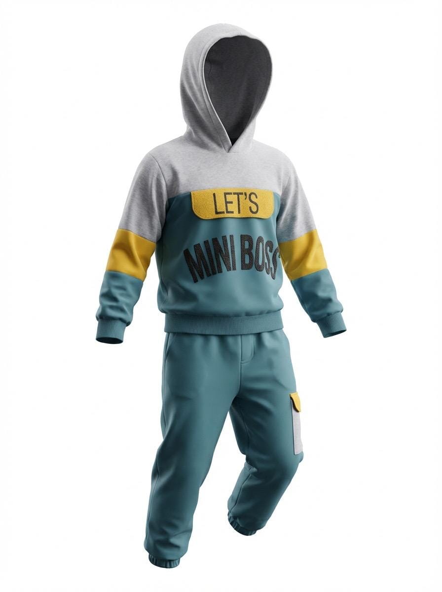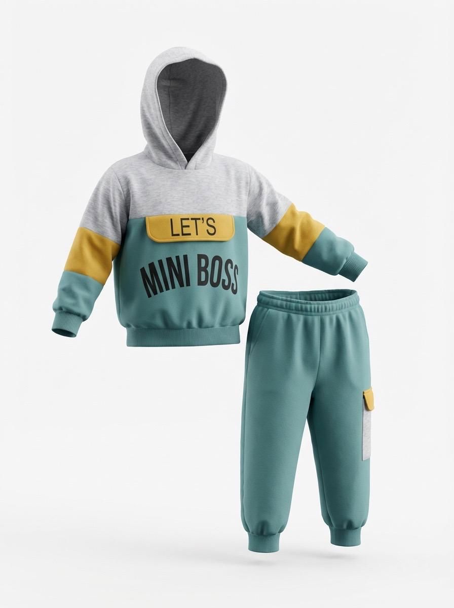 Luxury two-piece tracksuit set in premium 100% cotton with bold "LET'S MINI BOSS" graphic and modern color-block design. Perfect for active play, comfortable lounging, and stylish everyday wear.