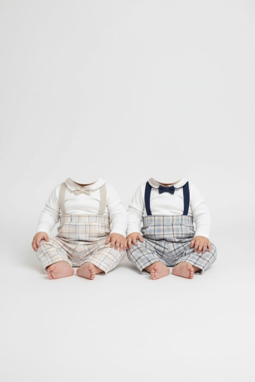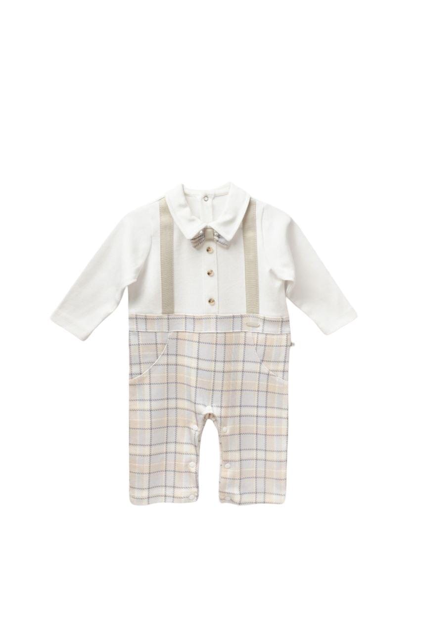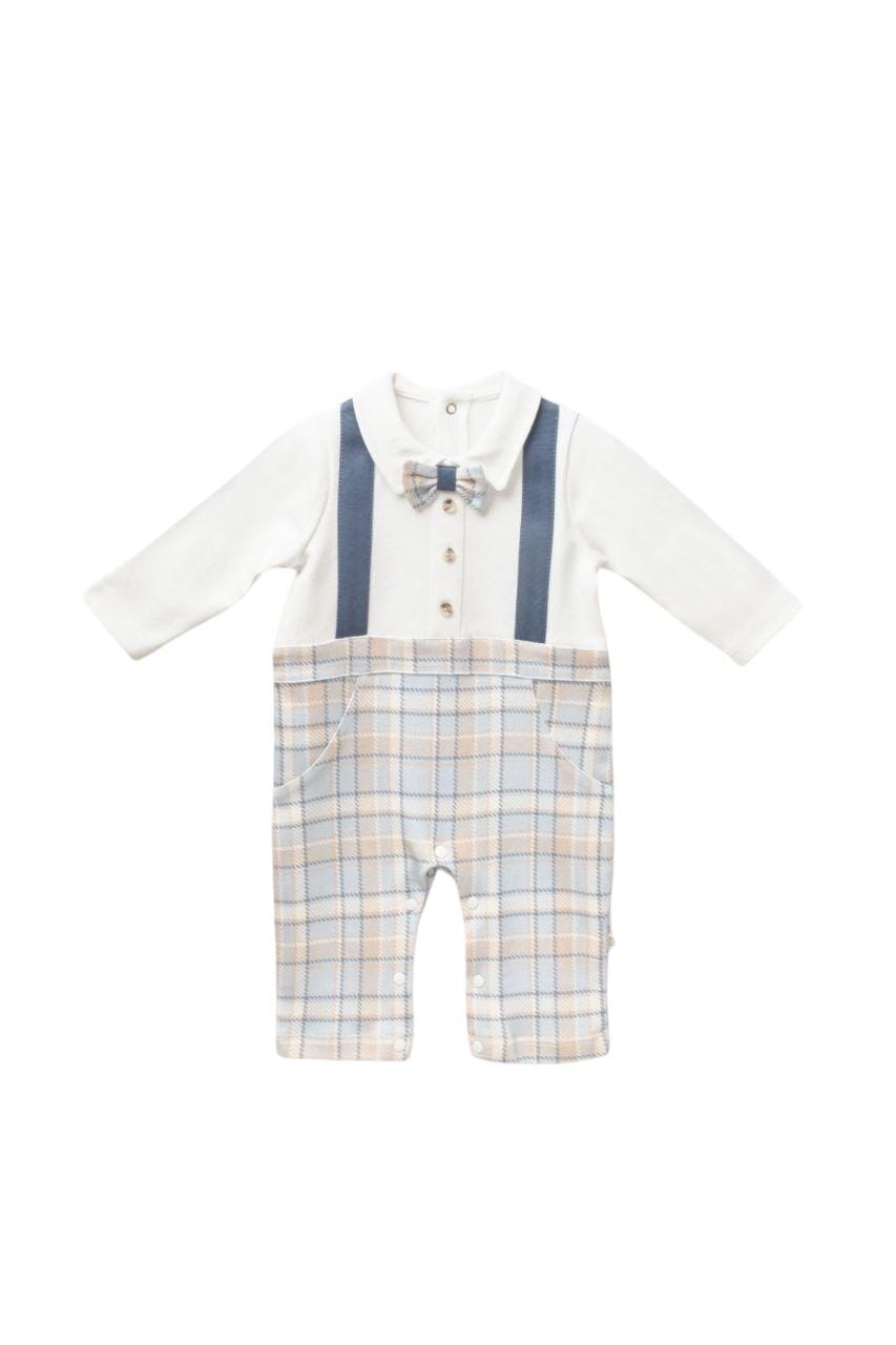 This sweet checked romper makes dressing your little gentleman effortless. With its smart collar, decorative braces, and adorable bow tie detail, it's perfect for christenings, family celebrations, or special photo moments.