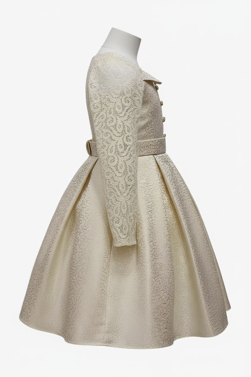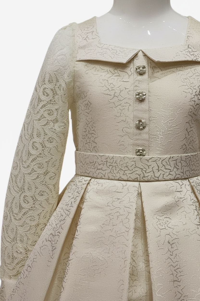 Just add smart shoes and a headband. Whether she's celebrating Eid, attending a wedding, or joining a special family occasion, this sophisticated dress is exactly what you've been looking for. Designed with an elegant collar, decorative buttons, and long lace sleeves, it flows into a pleated skirt that creates a flattering, timeless silhouette. The soft lining ensures all-day comfort while she looks picture-perfect.
