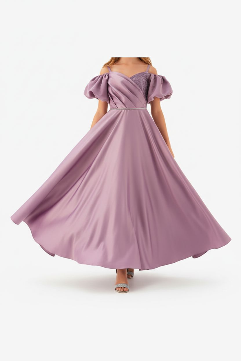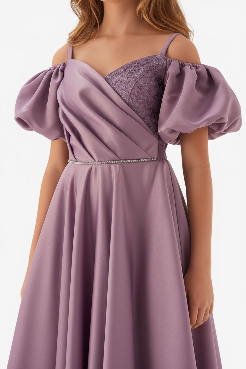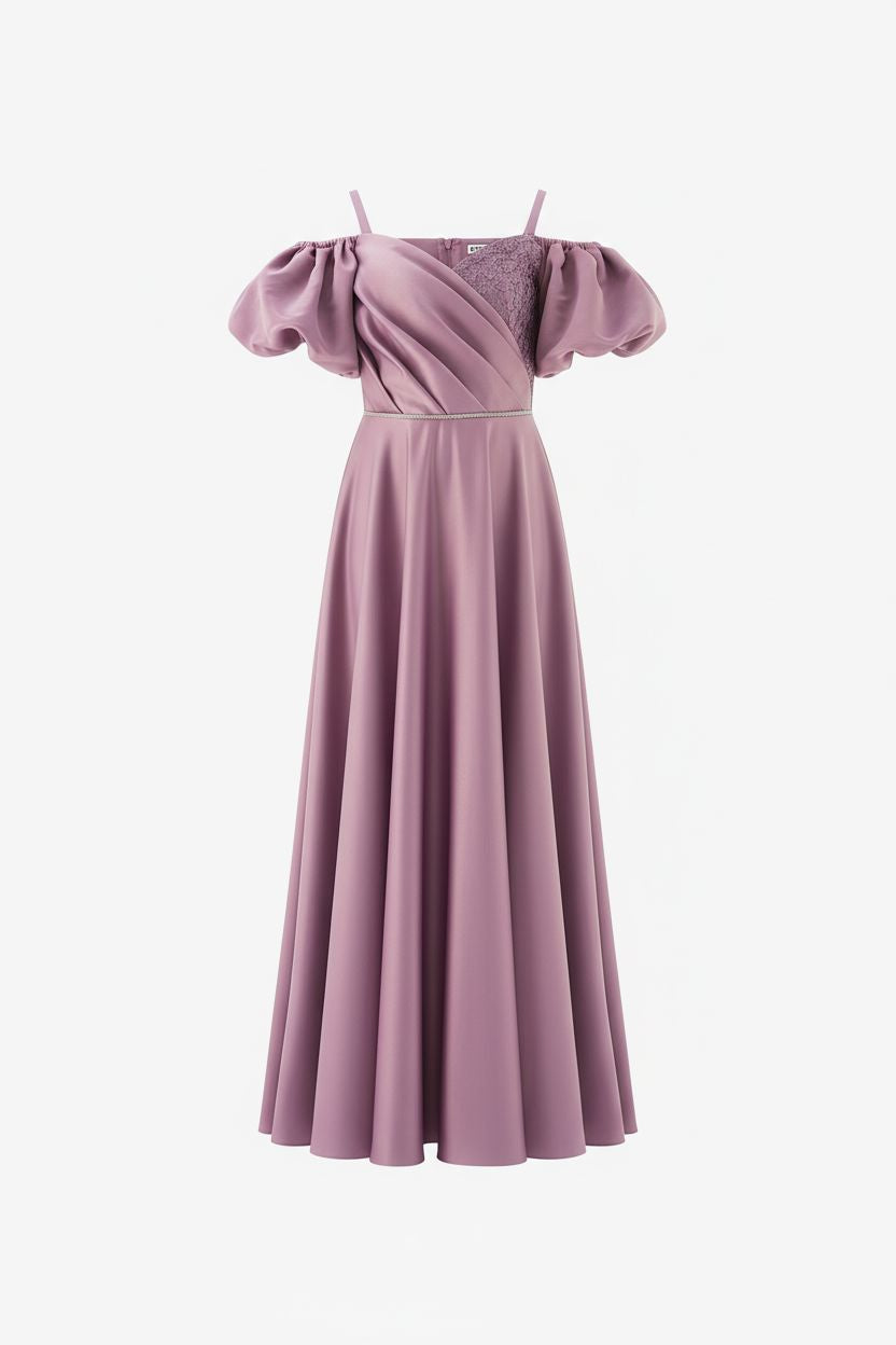 A stunning purple satin maxi dress perfect for Eid al-Fitr, weddings, and special occasions. This elegant design features an off-shoulder neckline, puffed sleeves, and a wrapped front detail. The comfortable lining ensures both style and ease for your special moments.