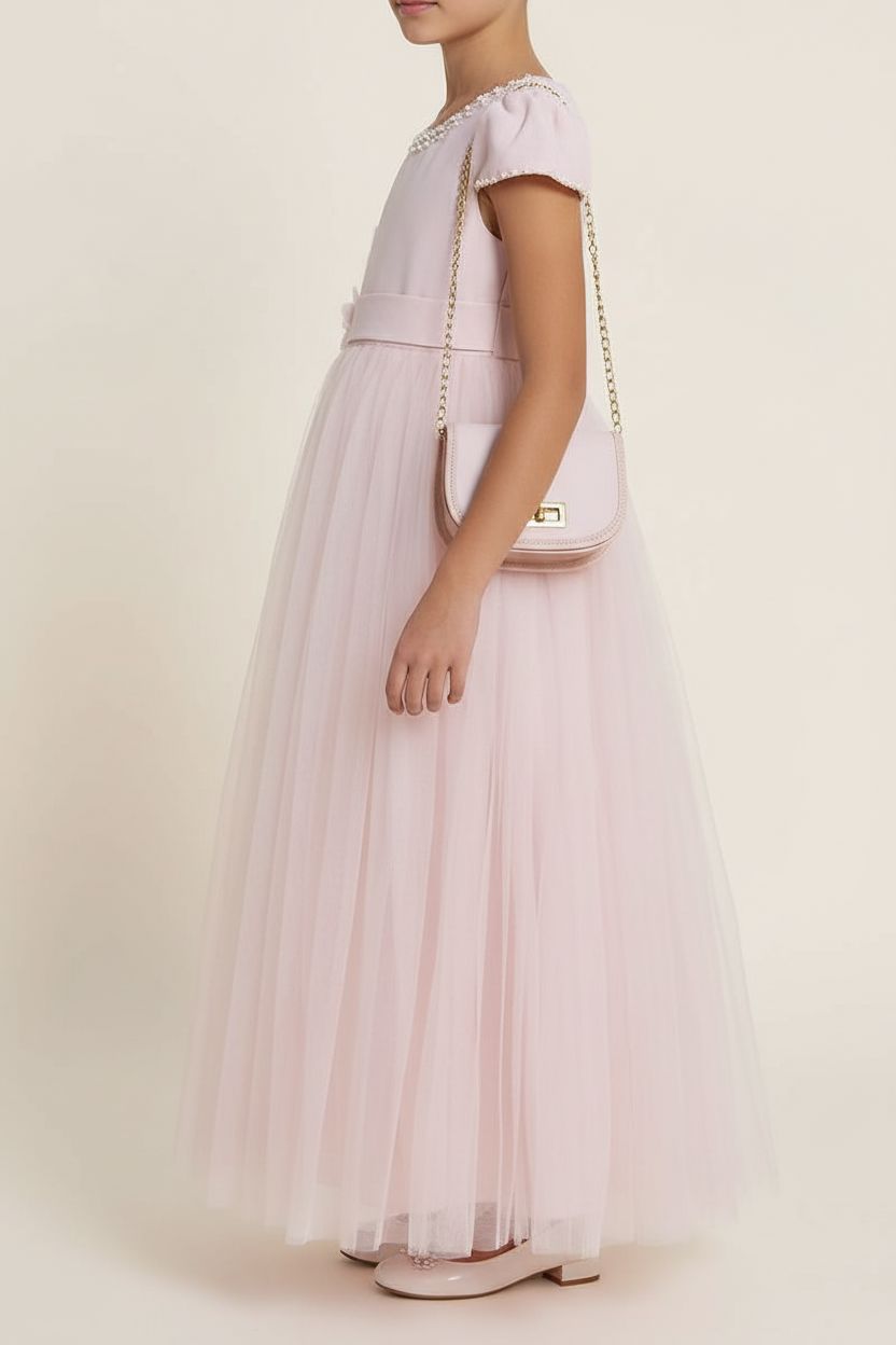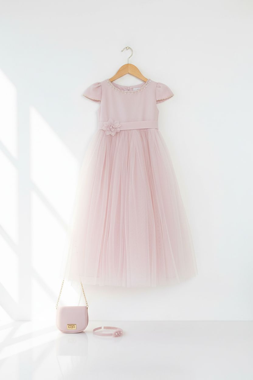 Show off your little one in this stunning dusty pink tulle dress with matching accessories. This refined piece showcases delicate tulle layers in a dreamy dusty pink shade, offering a sophisticated and elegant look.