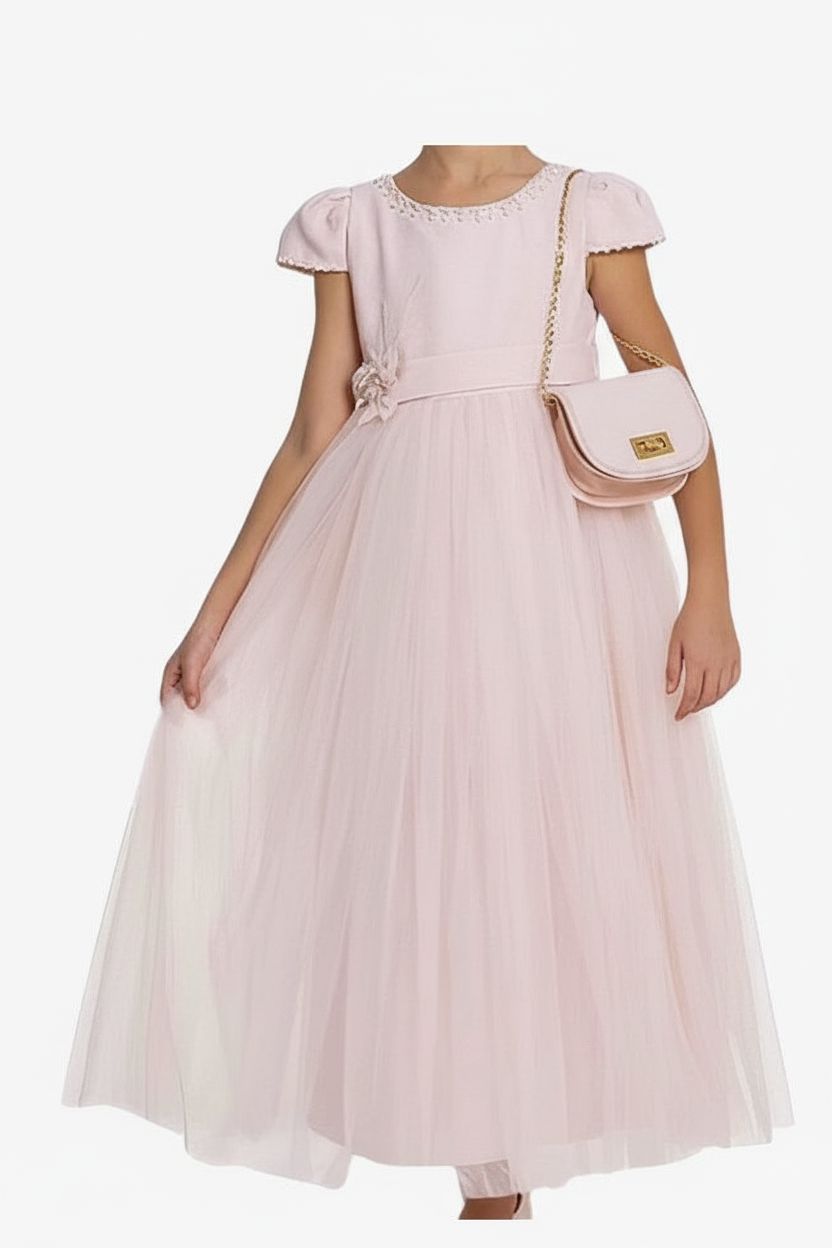 The beautifully crafted bodice complements the skirt, meticulously constructed with soft tulle layers that create a graceful silhouette. A perfect blend of grace and charm, this dress is ideal for special occasions, celebrations, and memorable family moments.