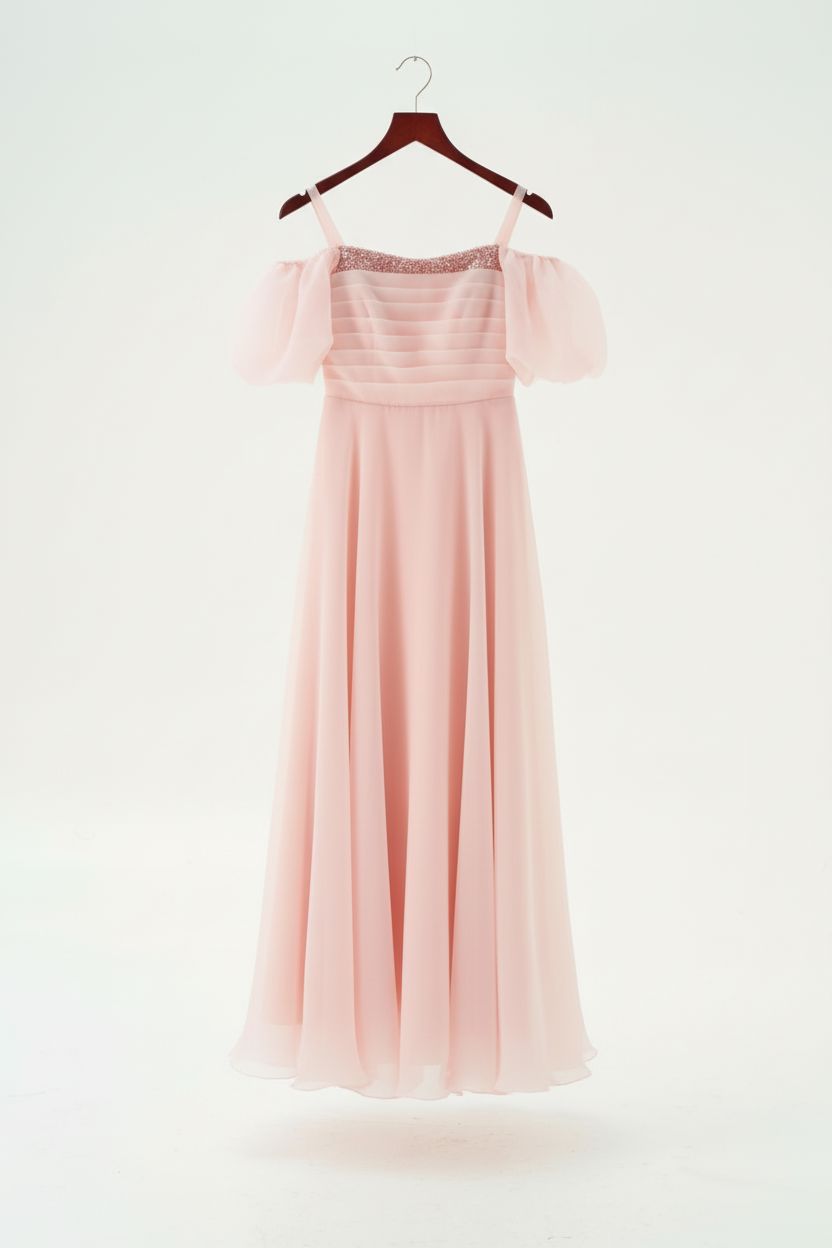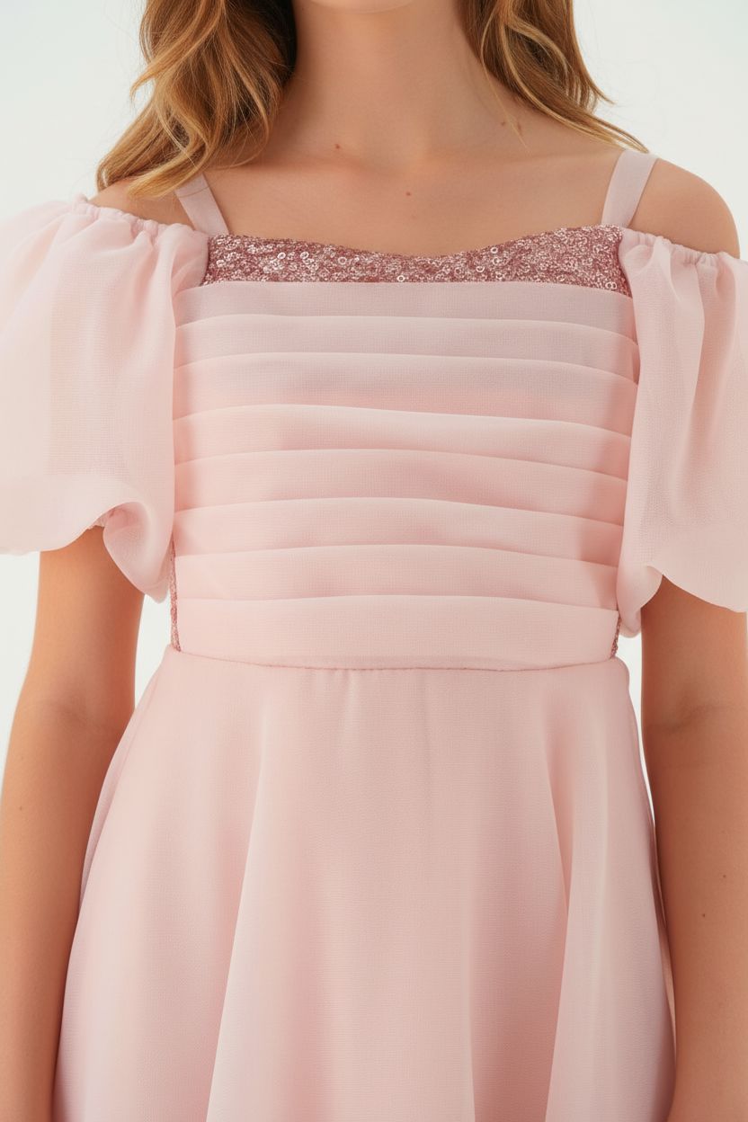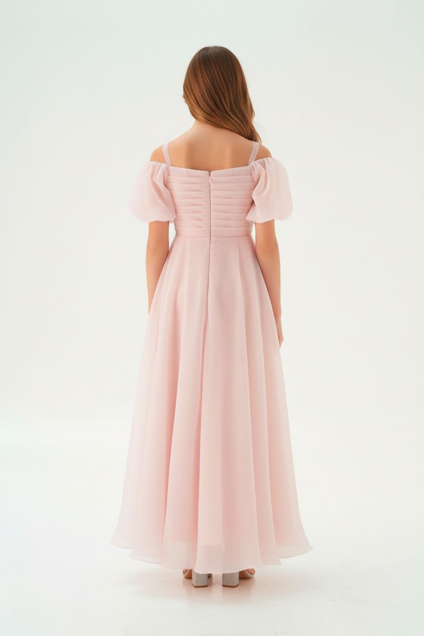 Show off your teen in this stunning blush pink taffeta maxi dress that brings elegance and sophistication to every special occasion. This beautiful piece features a pleated bodice with delicate embellished neckline trim, dramatic puff sleeves, and a flowing A-line skirt that creates a graceful, princess-worthy silhouette.
