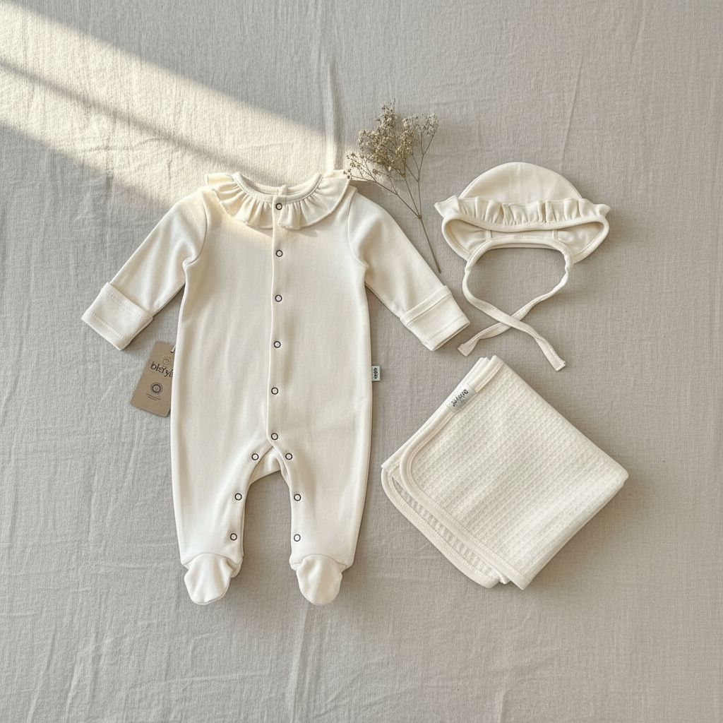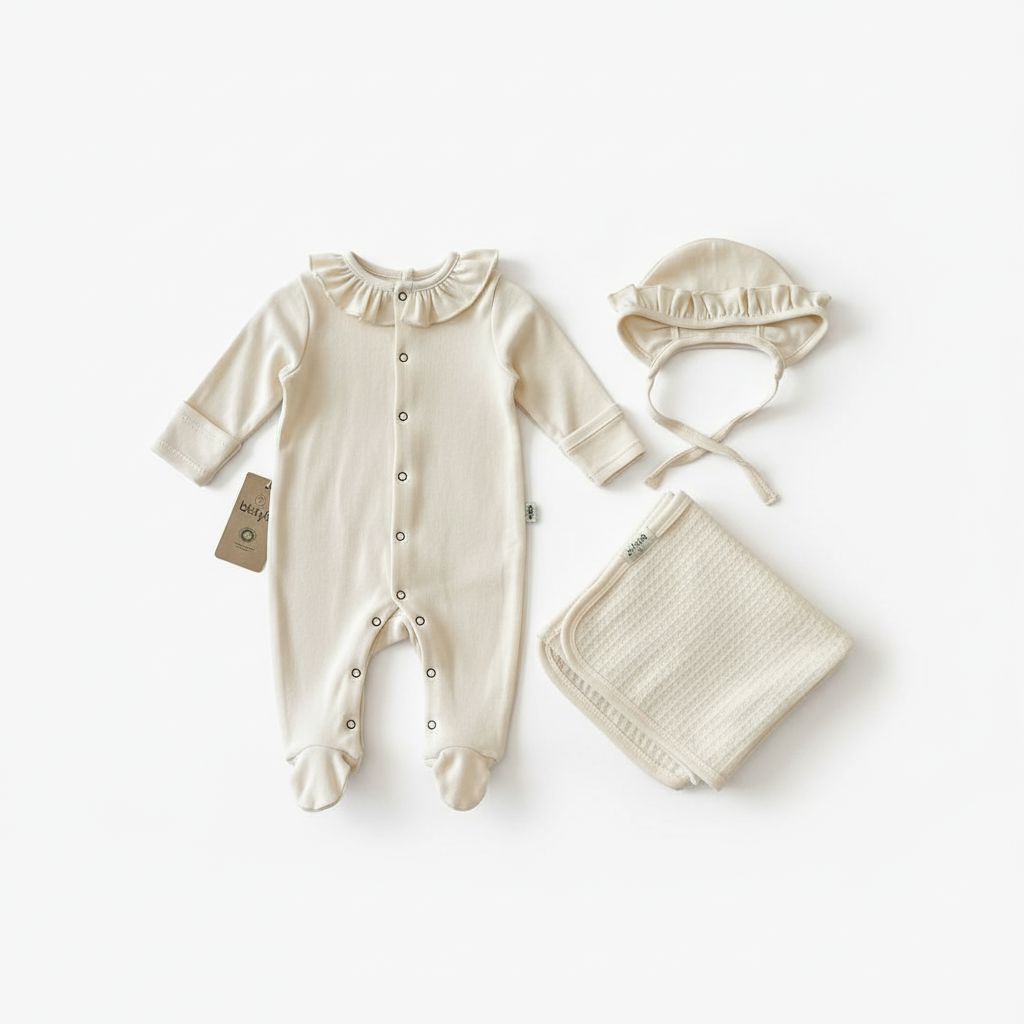 A complete 3-piece newborn set in soft cream, crafted from 100% cotton. Features a ruffle-collar romper with full-length button closure and built-in feet, a matching ruffle-trim bonnet with ties, and a textured knit blanket.